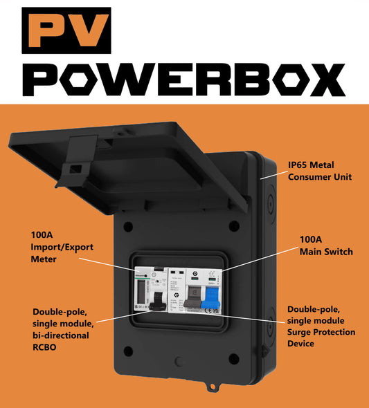PV POWERBOX IP65 Black Metal Solar / EV Consumer Unit with Import/Export Meter, RCBO and SPD
