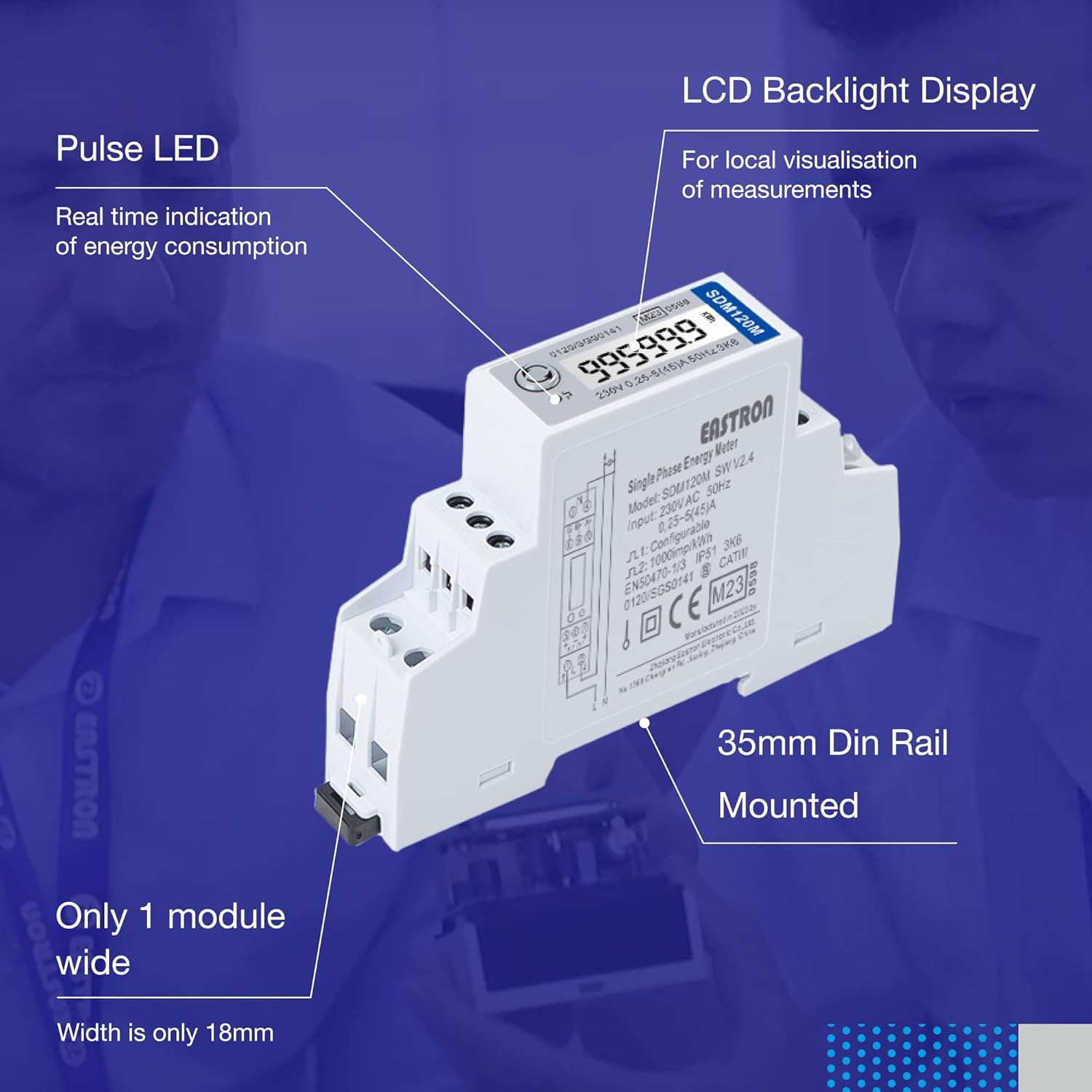 The SDM120-MBUS-MID is a Single Phase Digital Power Meter that measures a range of parameters in a 45A AC Circuit, removing the need for additional current transformers. This particular meter has proven to be very popular due to how cost-effective it is. Unlike other meters available on the market, this model has Pulse and MBUS communications built-in, eradicating the requirement of purchasing extra modules. The SDM120 Series is housed in a 1-DIN (17.5mm) case meaning it is compact and space-saving. This specific model measures Voltage, Current, Power Factor, Active Power, Reactive Power, Apparent Power, Total Active Energy, Import & Export Active Energy.