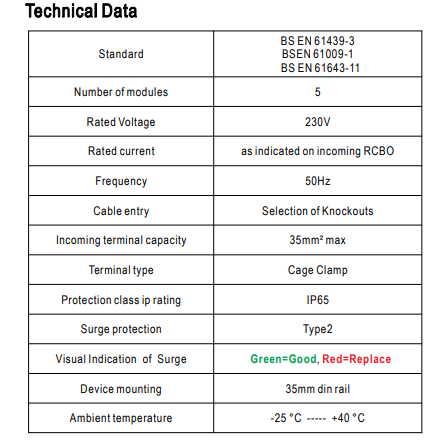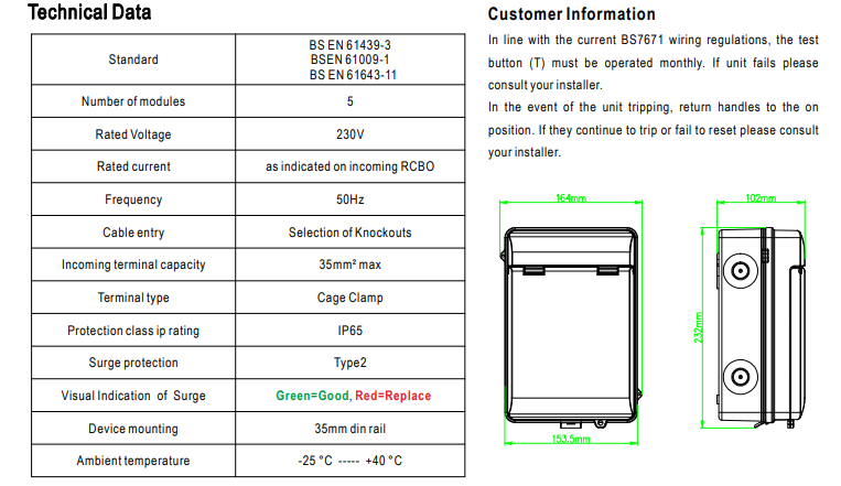 In line with the current BS7671 wiring regulations, the test button (T) must be operated monthly. If unit fails please consult your installer. In the event of the unit tripping, return handles to the on position. If they continue to trip or fail to reset please consult your installer. Standard BS EN 61439-3 BSEN 61009-1 BS EN 61643-11 Number of modules 5 Rated Voltage 230V