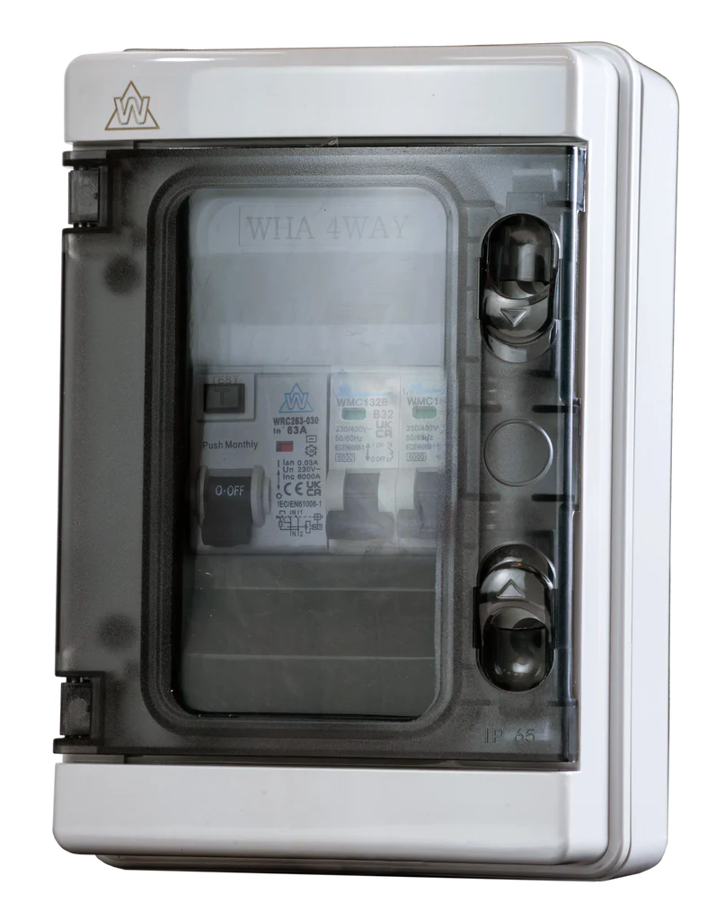 Plastic 4 way IP65 rated garage unit with 63A 30mA RCD plus two MCB’s