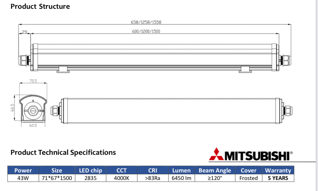 LED BATTEN 1.5M IP66/IK10 43w 6450LM